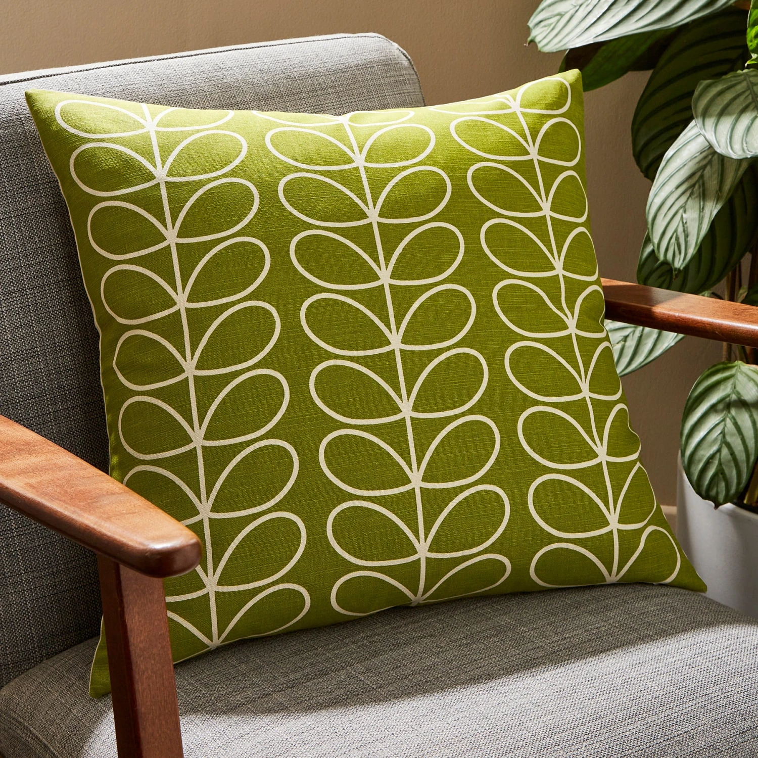 Add a pop of colour to your home with our classic linear stem print cushion in calming pear and white palette, a new take on Orla for this season.